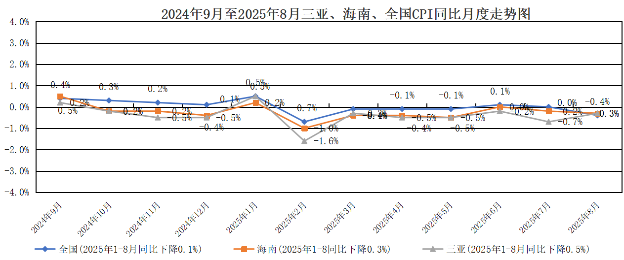 (2)居民消费价格指数(CPI)情况。据国家统计局三亚调查队数据显示,2025年1-8月份,我市居民消费价格指数同比累计下降0.5%(海南省累计下降0.3%,全国累计下降0.1%)。其中,8月份我市CPI同比下降0.3% (海南省下降0.3%,全国下降0.4%)。