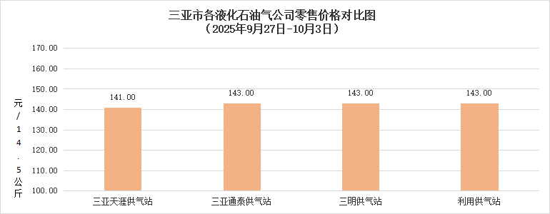 2.我市本周零售均价142.50元/14.5公斤.瓶(不含劳务费),环比持平,同比下降1.04%。2025年1-9月份瓶装液化气累计零售均价144.24元/14.5公斤.瓶,较2024年价格基本持平。