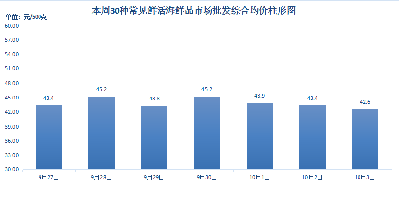 (四)我市本周海鲜餐饮店经营的30种常见鲜活海鲜品市场批发综合均价44.08元/500克,环比上涨12.32%。2025年1-9月累计30种常见鲜活海鲜品市场批发综合均价46.56元/500克,较2024年价格下降1.94%。