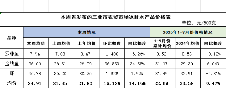 我市本周冰鲜水产品零售均价24.91元/500克,环比、同比分别上涨16.13%、14.16%。2025年1-9月份冰鲜水产品累计零售均价23.69元/500克,较2024年价格基本持平。