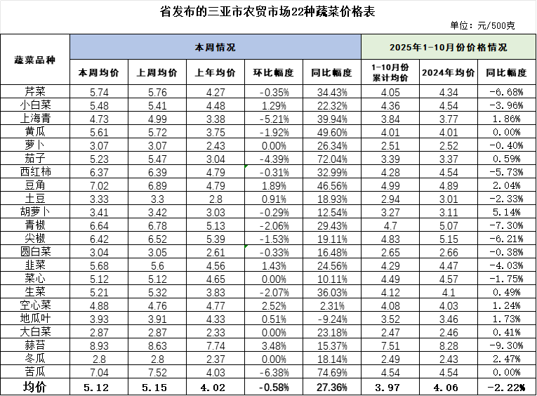 1.省政府纳入考核的我市22种蔬菜本周农贸市场零售均价5.12元/500克,环比基本持平,同比上涨27.36%。2025年1-10月份22种蔬菜累计零售均价3.97元/500克,较2024年同期价格下降2.22%。
