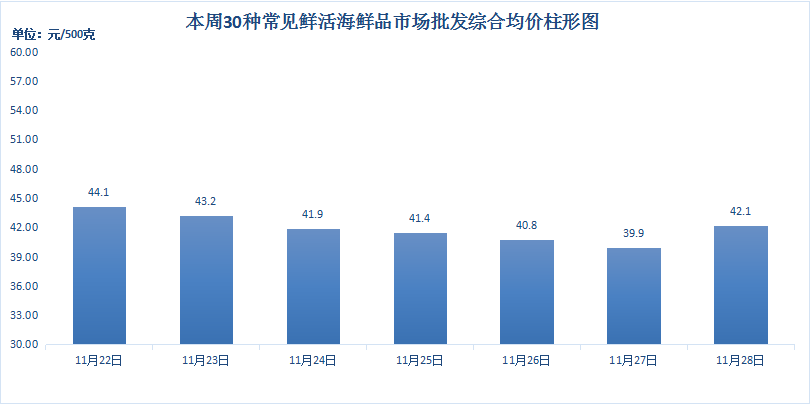 (四)我市本周海鲜餐饮店经营的30种常见鲜活海鲜品市场批发综合均价41.71元/500克,环比基本持平。2025年1-10月累计30种常见鲜活海鲜品市场批发综合均价45.26元/500克,较2024年价格下降2.73%。