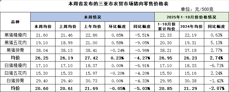 黑猪肉:我市本周零售均价26.25元/500克,环比基本持平,同比下降4.27%。2025年1-10月份黑猪肉累计零售均价26.95元/500克,较2024年价格上涨2.74%。